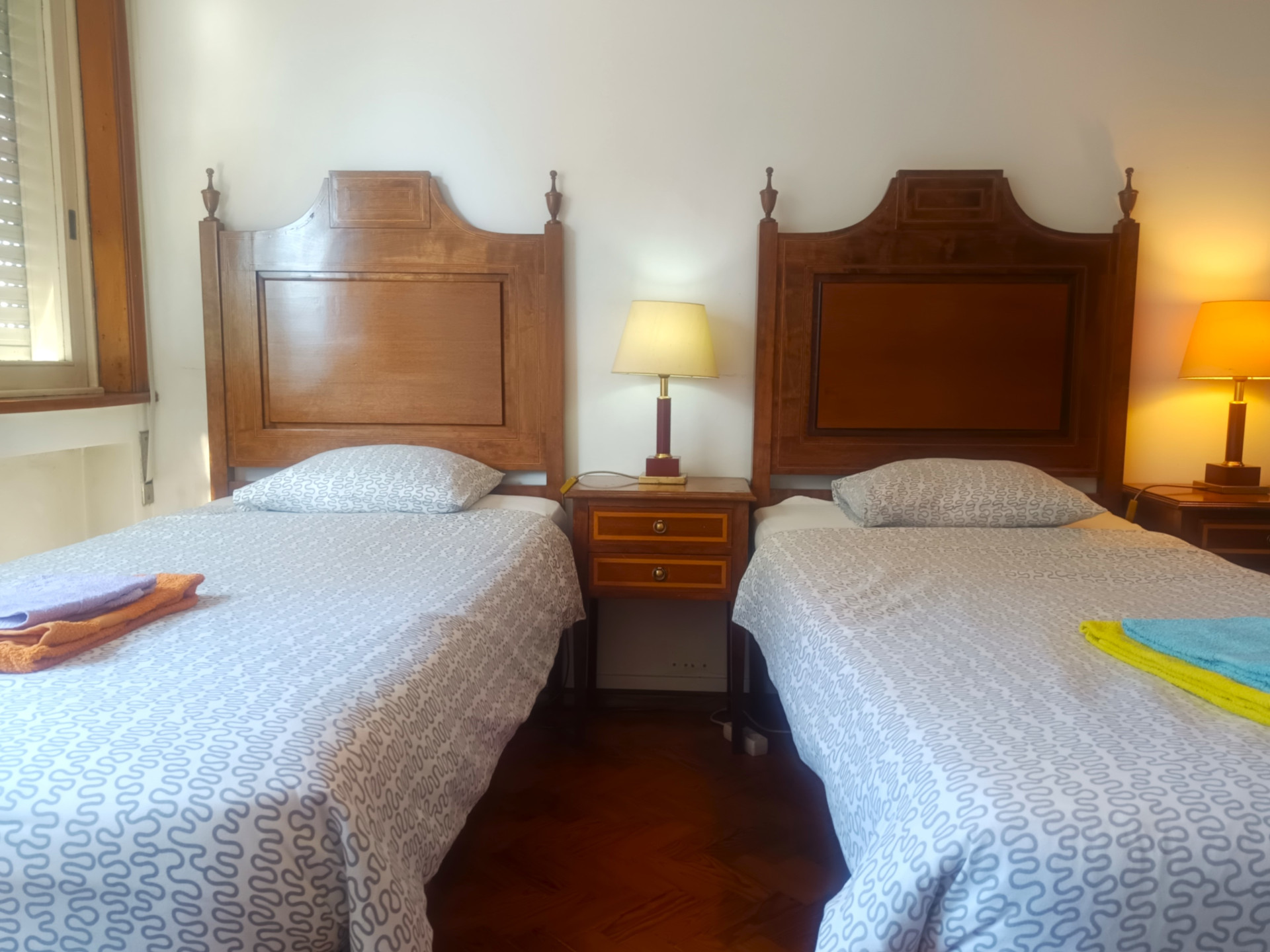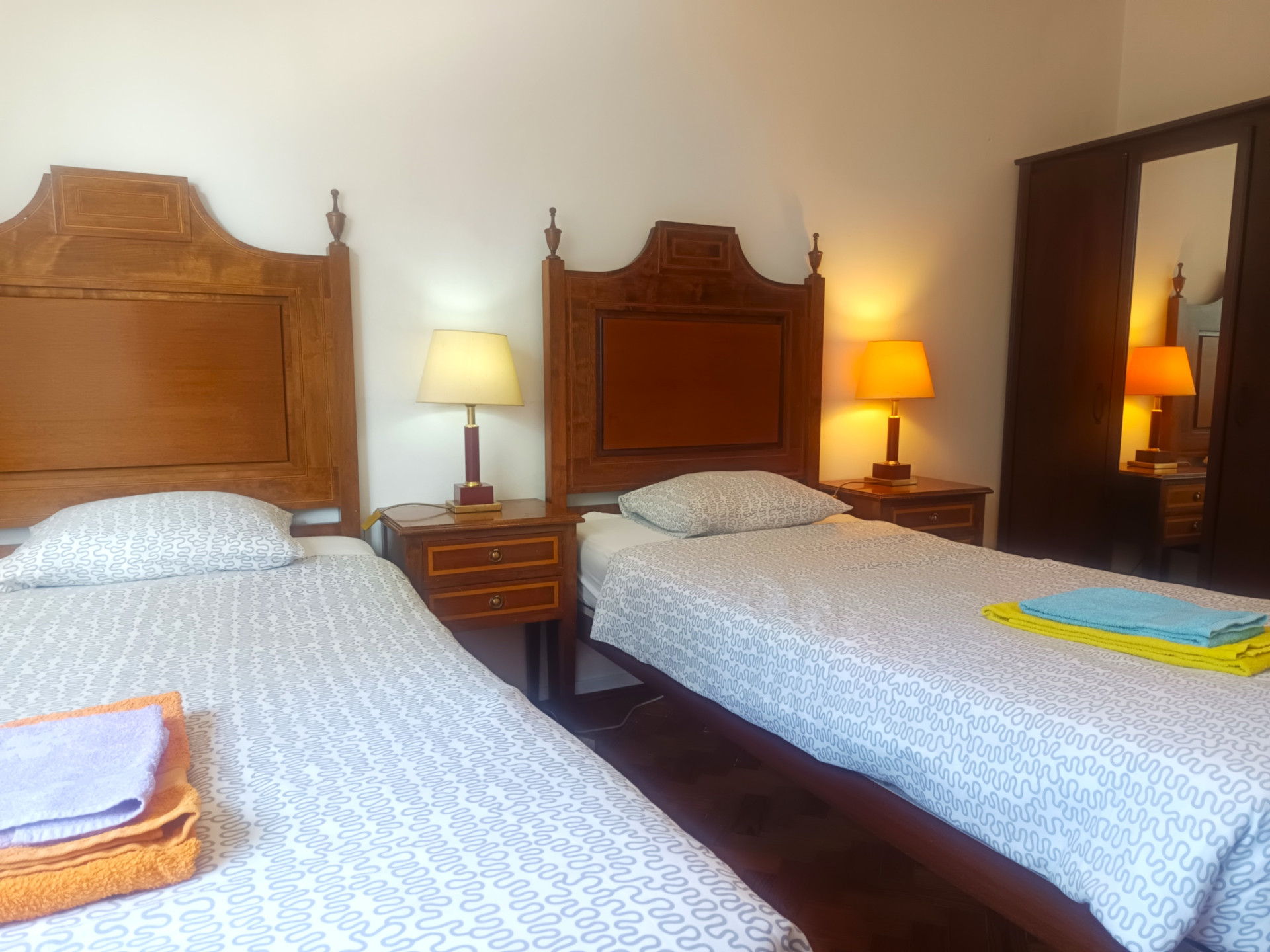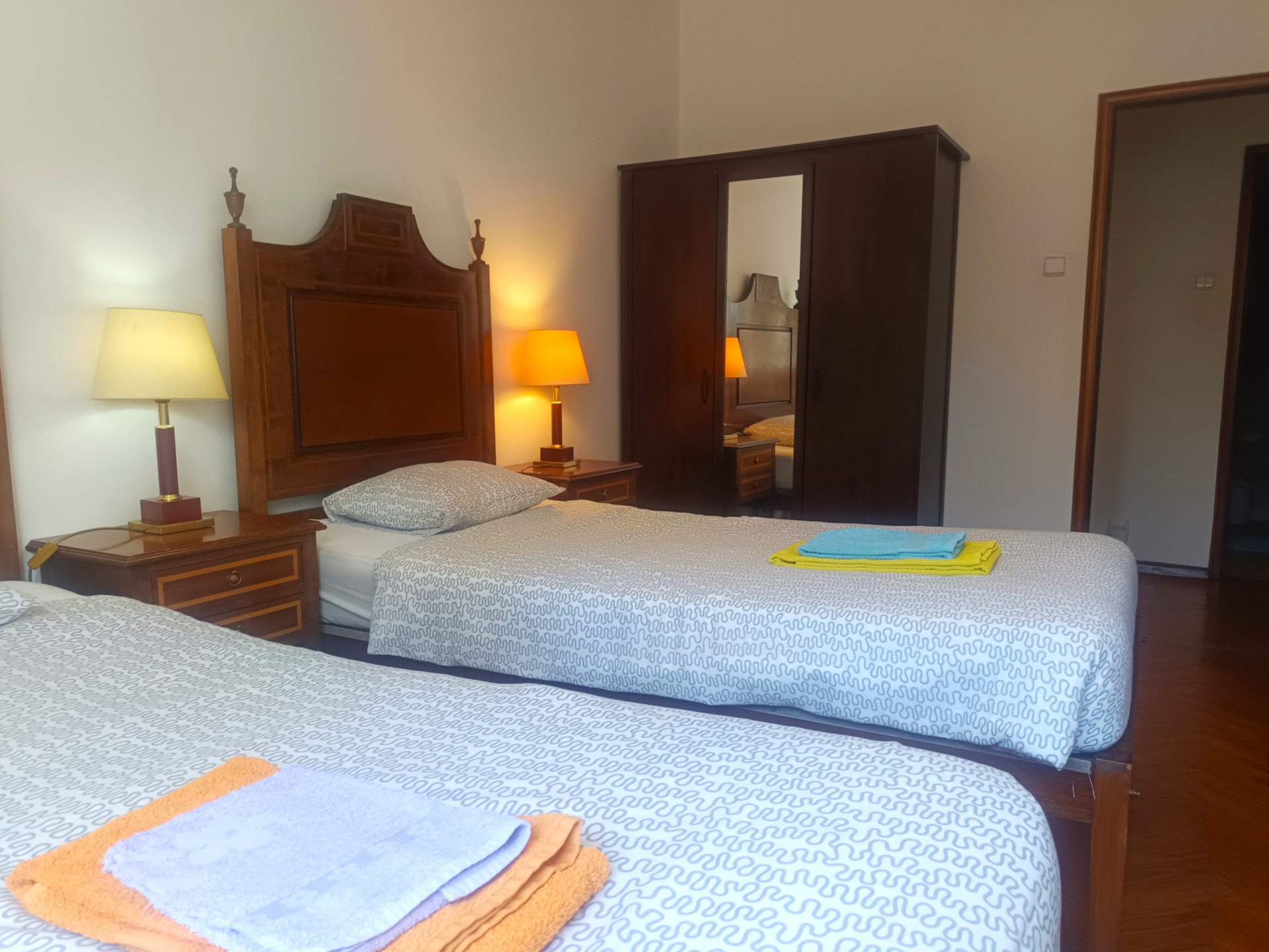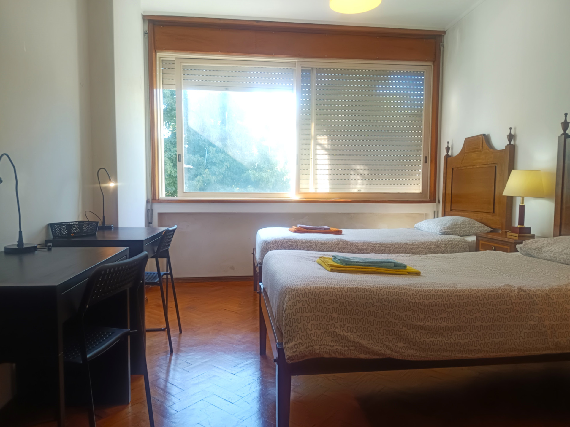 O quarto tem duas camas de solteiro (a roupa de cama é fornecida), armário, secretaria, aquecedor elétrico e uma área de 16 metros quadrados.