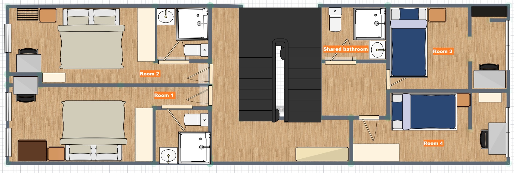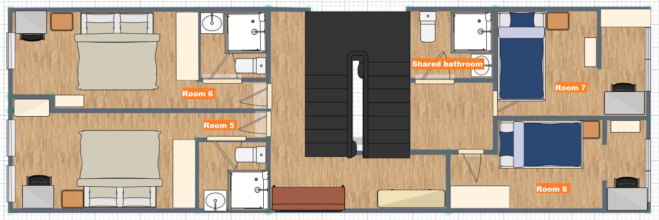 Completely furnished and equipped two story house in the center of Porto. At each floor there are 4 bedrooms, two suites (with private bathroom) and 2 individual rooms with a shared bathroom. On the ground floor there are the common areas: living area, kitchen and a small patio. The expenses are all included in the price, up to 50€/month/room. The closest metro stop is 24 de Agosto (lines A, B, C and F), located 10 minutes away by feet.